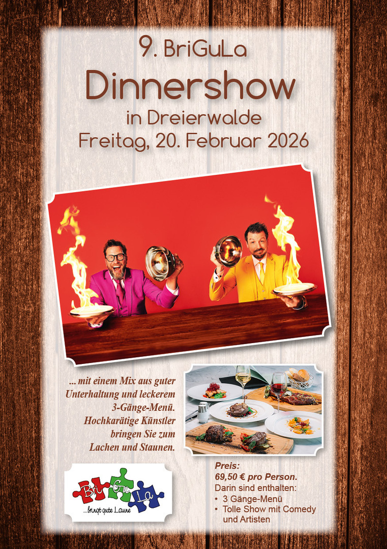 Das Künstlerduo Timothy Trust & Diamond hat uns für den 7. März 2025 anlässlich unserer 8. BriGuLa Dinnershow seine Zusage gegeben, den Abend zu gestalten. Daneben gibt es natürlich wieder ein köstliches Abendmenü von Restaurant-Chefin Angelika Lütkemeyer mit ihrem Team von Lütkemeyer`s Gasthof.